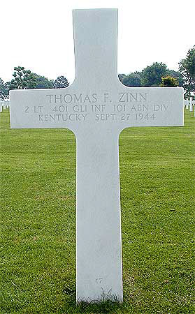 Thomas Zinn était originaire de Russell dans le Kentucky. Il était 2ndLieutenant au sein de la Compagnie F du 401stGIR de la 101stAirborne Division. Il perdit la vie le 27 septembre 1944 près de Grafwegen en Hollande. Il était à la tête d’une patrouille quand celle-ci fut prise sous le feu d’une mitrailleuse Allemande. Zinn et son Sergent furent tués instantanément.